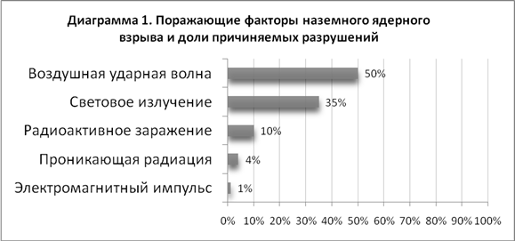 Поражающие факторы наземного ядерного взрыва и примерные соотношения между ними по причиняемым разрушениям приведены в диаграмме 1.