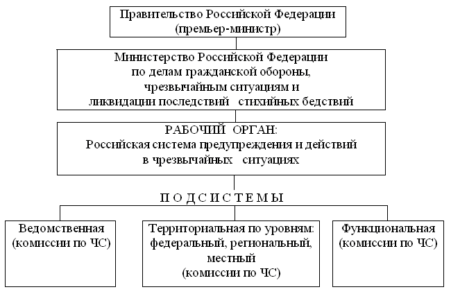 Одним из направлений в деятельности Министерства является руководство созданием и развитием Российской системы предупреждения и действий в чрезвычайных ситуациях (РСЧС). Она создана с целью объединения усилий федеральных и местных органов исполнительной власти, их сил и средств в деле предупреждения и ликвидации чрезвычайных ситуаций. Функциональная схема РСЧС представлена на рис. 4.2.