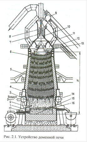Доменная печь имеет стальной кожух, выложенный внутри огнеупорным шамотным кирпичом. Рабочее пространство печи включает колошник 6, шахту 5, распар 4, заплечики 3, горн 1, лещадь 15. В верхней части колошника находится засыпной аппарат 8, через который в печь загружают шихту (офлюсованный агломерат и окатыши). Шихту взвешивают, подают в вагонетки 9 подъемника, которые передвигаются по мосту 12 к засыпному аппарату 8 и, опрокидываясь, высыпают шихту в приемную воронку 7 распределителя шихты. При опускании малого конуса 10 засыпного аппарата шихта попадает в чашу 11 , а при опускании большого конуса 13 - в доменную печь, что предотвращает выход газов из доменной печи в атмосферу. Для равномерного распределения шихты в доменной печи малый конус и приемная воронка после очередной загрузки поворачиваются на угол, кратный 60°.
