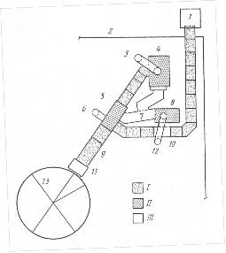 Схема крытого литникового хода и мест размещения вытяжных устройств в литейном цехе у доменной печи, где расположена система улавливания дыма: 1 - шлаковая траншея; 2 - стена литейного цеха; 3 - соединение с трубопроводом, расположенным под полом; 4 - вытяжка над наклонным литниковым ходом; 5 - вытяжка над ванной с расплавленным металлом; 6 - соединение с трубопроводом, расположенным под полом; 7 - открытый запасной литниковый ход; 8 - вытяжка над черпаком для отбора шлака; 9 - сменяемое покрытие; 10 - шлаковый порог; 11 - вытяжной колпак над леткой; 12 - соединение с трубопроводом, расположенным под полом; 13 - летка чугуна; I - укрытые площади на уровне пола; II - защитный покров с вытяжкой отработанных газов; III - открытые площади она состоит из воздухоочистительных устройств над леткой, над отсекателем, над подпором и над наклонным литниковым ходом с трубопроводом, установленным под полом, чтобы не мешать передвижениям крана. Хорошо герметизированное покрытие над литниковым ходом мешает подводу кислорода и ограничивает образование аэрозольных загрязнений из продуктов испарения. Для ограничения поступления кислорода можно обдувать поверхность металла паром или горячими газами. Проектная производительность прокачки воздуха (тыс. м3 /ч) вытяжных устройств улавливания отработанных газов (укрытие литникового хода в литейном цехе доменного производства) приведена ниже: