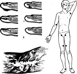 Рис. 1. Травмы и их последствия: А — гнойничковые поражения пальцев кисти; Б — шрам, образованный груб волокнистой соединительной тканью; В — точки прижатия сосудов для временной остановки артериального кровотечения.