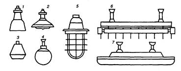 Рис. 2. Основные типы светильников: 1 — «Универсаль»; 2 — «Глубокоизлучатель»; 3 — «Люцетта»; 4 — «Молочный шар»; 5 — взрывобезопасный типа ВЗГ; 6 — типа ОД; 7 —типа ПВЛП