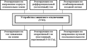 По видам средств защиты, взаимодействующих с УЗО, различают устройства, используемые с: защитным заземлением; занулением; автоматическим закорачиванием на землю поврежденной фазы (шунтированием цепи утечки тока замыкания на землю); компенсацией (автоматической или статической) тока утечки (замыкания на землю).