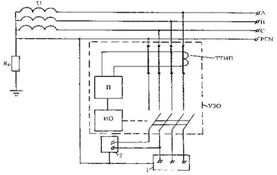 Датчиком такого устройства является трансформатор тока нулевой последовательности (ТТНП), на выходных обмотках которого формируется сигнал, пропорциональный току через тело человека Ih. Преобразователь УЗО (П) сравнивает значение входного сигнала с уставкой, значение которой определяется допустимым током через человека, усиливает входной сигнал до уровня, необходимого для управления исполнительным органом (ИО). Исполнительный орган, например, контактор, отключает электроустановку от сети в случае возникновения опасности поражения электрическим током в зоне защиты УЗО.