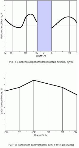 2. Колебание работоспособности. Зависимость работоспособности от времени суток. Колебание работоспособности в течение недели и рабочей смены