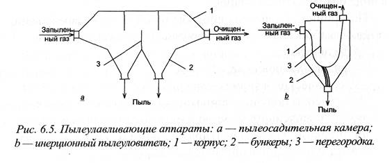 При размерах частиц пыли 25-50 мкм и высоких их концентрациях в газовом потоке (более 50 г/м3 ) обычно используют пылеосадительные камеры и инерционные пылеуловители (рис. 6.5).