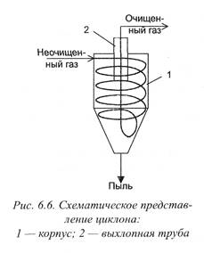 На рис. 6.56 изменение направления движения газа достигается с помощью перегородки. При этом частицы пыли по инерции направляются вниз, а очищенный газ выводится сверху.