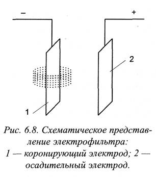 Они применяются в тех случаях, когда электрические свойства взвешенных частиц позволяют достичь высокой степени очистки. Электрофильтры обеспечивают выделение из газовых потоков мельчайших частиц пыли и тумана. Действие электрофильтров основано на ионизации газа между двумя электродами с образованием положительно и отрицательно заряженных ионов (рис. 6.8).