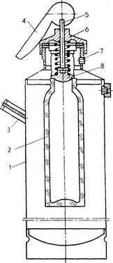 1- корпус; 2- стакан с кислотной частью заряда; 3-ручка; 4- рукоятка; 5- шток; 6- крышка; 7- спрыск; 8- клапан.