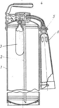 Воздушно-пенный огнетушитель ОВП-10 (рисунок 2) состоит из стального корпуса, в котором находится 4-6 % водный раствор пенообразователя ПО-1, баллончика высокого давления с углекислотой, для выталкивания заряда, крышки с запорно-пусковым устройством, сифонной трубки и раструба-насадки для получения высокократной воздушно-механической пены.