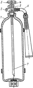 1- баллон; 2- предохранитель; 3- маховичок вентиля-заопра; 4- металлическая пломба; 5- вентиль; 6- поворотный механизм с раструбом; 7- сифонная трубка.