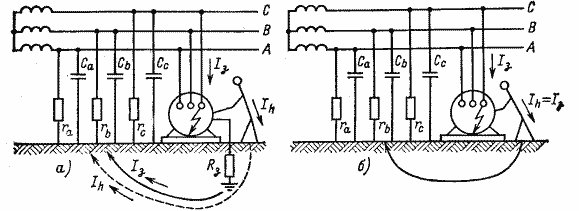 а – при исправном заземлении; б – при отсутствии заземления