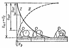 I – кривая распределения потенциалов; II - кривая распределения напряжения прикосновения