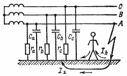 Прикосновение к заземленным нетоковедущим частям, оказавшимся под напряжением. Указанные части электроустановок (корпуса, оболочки, кабеля) могут оказаться под напряжением лишь случайно в результате повреждения изоляции. При случайном касании этих частей человек будет находиться под воздействием напряжения прикосновения (рис.2). Напряжение прикосновения - это напряжение между двумя точками цепи тока, которых одновременно касается человек (ГОСТ 12.1.009). При прикосновении человека к заземленному корпусу, имеющему контакт с одной из фаз, часть тока замыкания на землю будет проходить через человека, а если корпус не заземлен, то через человека проходит весь ток замыкания на землю (однополюсное прикосновение).