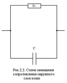 Между воздействующим током и напряжением существует нелинейная зависимость: с увеличением напряжения ток растет быстрее. Это объясняется главным образом нелинейностью электрического сопротивления тела человека. На участке между двумя электродами электрическое сопротивление тела человека в основном состоит из сопротивлений двух тонких наружных слоев кожи, касающихся электродов, и внутреннего сопротивления остальной части тела. Плохо проводящий ток наружный слой кожи, прилегающий к электроду, и внутренняя ткань, находящаяся под плохо проводящим слоем, как бы образуют обкладки конденсатора емкостью С и сопротивлением его изоляции Vн (рисунок 2). С увеличением частоты тока сопротивление тела человека уменьшается и при больших частотах практически становится равным внутреннему сопротивлению.