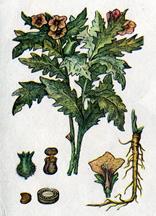 Ботаническая характеристика:двулетнее травянистое растение с одиночным ветвистым бороздчатым стеблем, клейким от железистых серозеленых волосков. Корень стержневой. В первый год растение образует розетку из прикорневых крупных яйцевидных или продолговатых листьев. На втором году вырастает стебель высотой 20 – 115 см. Стеблевые листья продолговато-яйцевидные, выямчато-перисто-надрезанные, мягкие, покрытые клейкими беловатыми железистыми волосками, с неприятным одурманивающим запахом. Прицветные листья продолговатые, почти цельные. Цветки довольно крупные, сидячие, находятся на верхушке стебля или в развилках в основании листьев. Чашечки длиной в 10 – 20 мм, трубчато-колокольчатые, в основании густо покрытые волосками. Венчик длиной в 20 – 45 мм с 5 лопастевидными лепестками. Окраска его кремово-желтая с темно-фиолетовыми прожилками и пятнами. Тычинок 5, из них 3 более длинные. Плод – кувшинчатая двухгнездная коробочка длиной 21 – 32 мм, открывающаяся наверху крышечкой, заключенная в отвердевшую чашечку с растопыренными наверху зубцами. Семена мелкоячеистые, буровато-сероватого цвета, круглые или слегка почковидные, сплюснутые, длиной около 1,5 мм. Вес 1000 семян 0,5 – 0,9 г. Цветет со второй половины мая до августа, плодоносит в июне – августе.