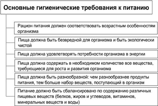 Таким образом, питание непосредственно обеспечивает все жизненно важные функции организма. Состав пищи, ее свойства и количество определяют рост и физическое развитие, трудоспособность, заболеваемость, нервно-психическое состояние, продолжительность жизни. Нормальная, полноценная деятельность человека, его рост и развитие зависят от питания и возможны только при условии постоянного поступления в организм в необходимом количестве питательных (органических и неорганических) веществ. Питание должно быть сбалансированным и рациональным, т.е. содержать в оптимальном соотношении компоненты пищи (белки, жиры и углеводы). В пищевой рацион должны обязательно включаться мясо, рыба, молоко (источники жиров и белков), овощи и фрукты (источники углеводов).