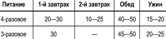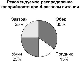 Оптимальным считается четырехразовый прием пищи с интервалами в 4-5 часов, в одно и то же время. При этом завтрак должен составлять 25% суточного рациона, обед — 35%, полдник — 15% и ужин — 25%. Ужинать рекомендуется не позднее чем за 3 ч до сна.