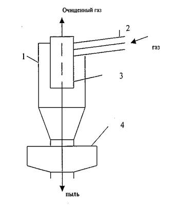 Работа циклона основана на использовании центробежных сил, возникающих при вращении газопылевого потока внутри корпуса аппарата. Вращение достигается путем тангенциального ввода потока в циклон. В результате действия центробежных сил частицы пыли, взвешенные в потоке, отбрасываются на стенки корпуса и выпадают из потока. Чистый газ, продолжая вращаться, совершает поворот на 180 градусов и и выходит из циклона через расположенную по оси выхлопную трубу( рис. 2.1.1)