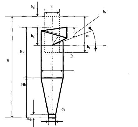 Область циклонного процесса, или зона улавливания пыли, расположена между концом выхлопной трубы и пылеотводящим отверстием циклона. Часть этой зоны занимает корпусный патрубок. В нем оканчивается циклонный вихрь, В цилиндрическом циклоне (Без корпусного патрубка) циклонный вихрь опирается на пылевой слой в бункере аппарата. При этом частицы вторично уносятся из бункера, т.е. происходит явление, аналогичное действию атмосферных вихрей на предметы, находящиеся на поверхности земли. Вторичный унос частиц возникает и тогда, когда выбран чрезмерно большой угол конусности нижнего патрубка циклона.