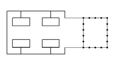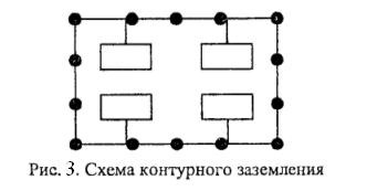 Контурное заземление показано на рис. 3. Заземлители располагаются по контуру заземляемого оборудования на небольшом (несколько метров) расстоянии друг от друга. В данном случае поля растекания заземлителей накладываются, и любая точка поверхности земли внутри контура имеет значительный потенциал. Напряжение прикосновения будет меньше, чем при выносном заземлении.