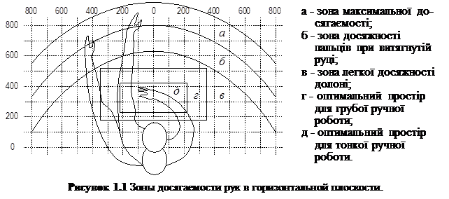 Максимальна зона досяжності рук - це частина моторного поля робочого місця, обмеженого дугами, описуваними максимально витягнутими руками при русі їх в плечовому суглобі.