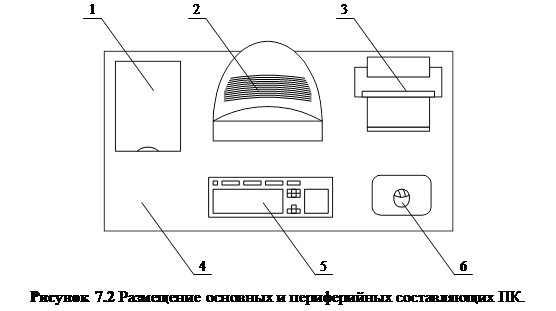 На рис. 2.2 показаний приклад розміщення основних і периферійних складових ПК на робочому столі програміста.