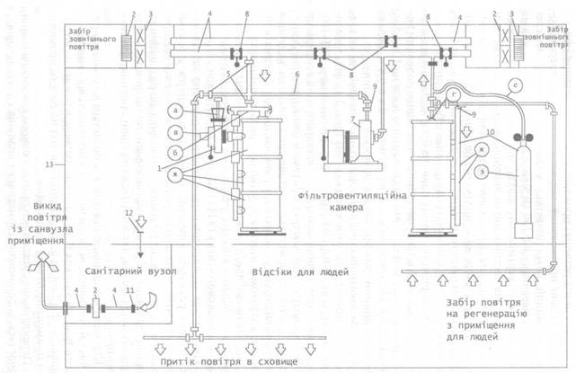 Система повітропостачання з фільтровентиляційним обладнанням промислового виготовлення включає (рис. 1): фільтровентиляційний агрегат (ФВА-49) 1 (а — фільтри-поглиначі ФГТ-100, б — здвоєний герметичний клапан, в — електроручний вентилятор)РВ-49, г — витратомір повітря); противибуховий пристрій 2; проти пилові фільтри 3; герметичні повітроводи 4; фланцеві з'єднання 5; повітророзвідну сітку 6; електроручний вентилятор 7; герметичні клапани 8; витратомір повітря 9; установку регенерації повітря 10 (д — ущільнені шибери, є — кисневий шланг, ж — регенеративні патрони, з — балон з киснем); регулюючу термічну заглушку 11; клапан надлишкового тиску (КНТ) 12; лінію герметизації 13.