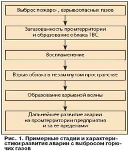 Аварийная утечка горючих газов (в том числе сжиженных), легковоспламеняющихся жидкостей (ЛВЖ), а также их залповый выброс из поврежденной части технологического оборудования являются непосредственными источниками загазованности открытых установок потенциально опасных предприятий. В общем случае ход развития подобных аварий можно разделить на несколько стадий (рис. 1).