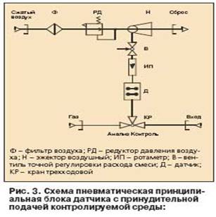 В режиме анализа через штуцер "Газ" и кран трехходовой КР в положении "Анализ" контролируемая среда поступает на датчик Д и через ротаметр ИП и эжектор Н сбрасывается вместе со сжатым воздухом.