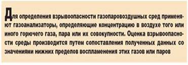 Для определения взрывоопасности газопаровоздушных сред применяют газоанализаторы, благодаря которым определяют концентрацию в воздухе того или иного горючего газа, пара или их совокупности. Оценка взрывоопасности среды производится путем сопоставления полученных данных со значениями нижних пределов воспламенения этих газов или паров.