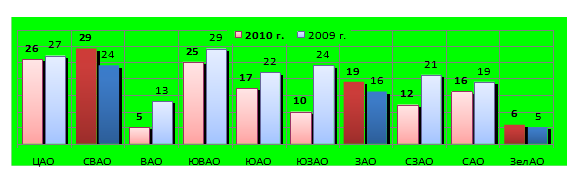Наибольшее количество пожаров на указанных объектах произошло в СВАО (29), ЦАО (26), ЮВАО (25) и ЗАО (19). Отмечен рост пожаров на предприятиях торговли в СВАО — на 20,8%, ЗАО — на 18,8% и Зеленоградский АО — на 20%.