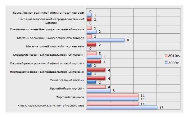 Анализ статистических данных свидетельствует о том, что наибольшее число пожаров приходится на объекты мелкорозничной торговли(торговые павильоны, киоски, ларьки и т.д.) — 11 случаев и торговые павильоны — 11 случаев, что составляет по 25% от общего числа пожаров в данной категории объектов.