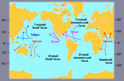 Ураганы - тропические циклоны с ветрами, достигающими силы более 64 узлов (74 миль в час) и дующими против часовой стрелки относительно их центра в Северном полушарии и по часовой стрелке - в Южном.