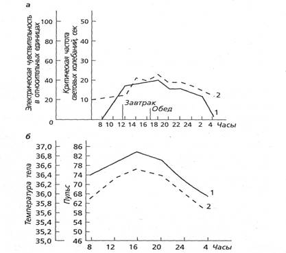а – нормальные суточные кривые лобильности (сплошная линия) и электрической чувствительности зрительного анализатора (пунктирная линия); б – нормальные суточные кривые температура тела (сплошная линия) и частоты пульсовых ударов (пунктирная линия)