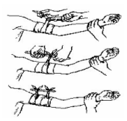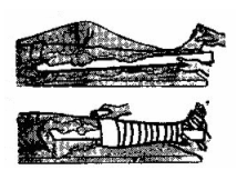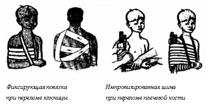 г) шину прибинтовать к руке поверх одежды ( при отсутствии шины для мобилизации использовать картон, дощечки и т.д.);