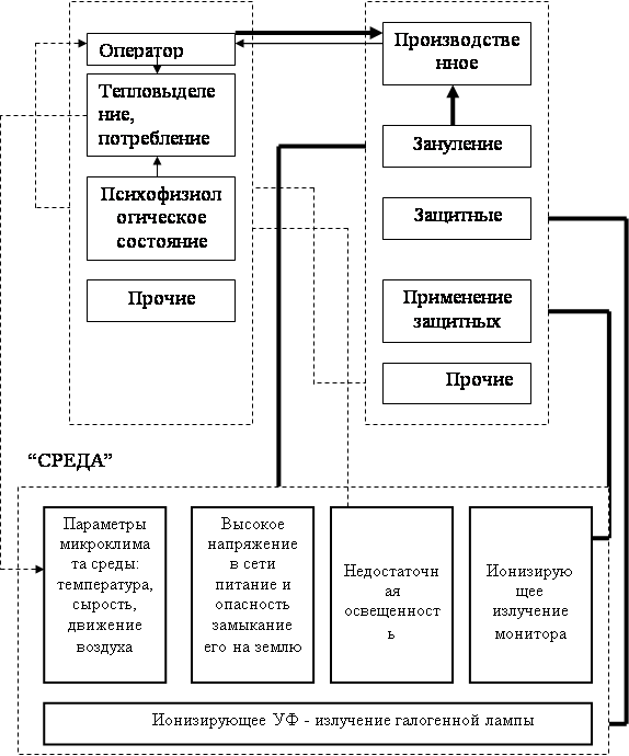 Люди, работающие в помещении, совместно с оборудованием, образуют систему «человек – машина - среда» («Ч-М-С»). Элементами этой системы являются: человек – производственный персонал; машина – все оборудование, а также осветительные и нагревательные приборы; среда – производственная среда в помещении, взаимосвязь в системе «Ч-М-С» представлена на рис.1. В системе «Ч-М-С» при определенных условиях могут возникать следующие опасности: Аномальный микроклимат, выполнение тяжелой умственной работы, информационная опасность, несоответствие показателей освещения характеристикам человека, пожароопасность, опасность поражения электрическим током, механические опасности, токсические химические вещества.