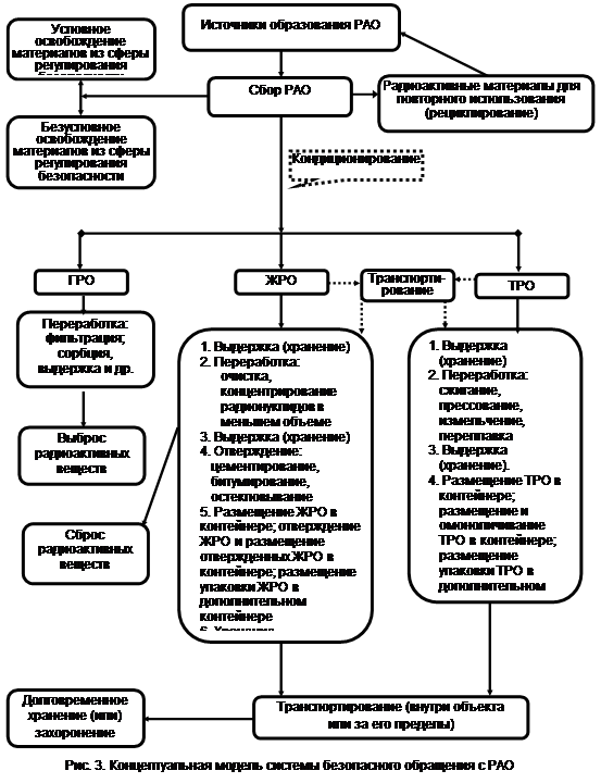 Концептуальная модель структурирует систему обращения с РАО со всем разнообразием объектов - источников образования РАО, видов РАО и видов деятельности с ними на отдельные подсистемы - этапы обращения с РАО от их образования до захороненияи тем самым позволяет значительно уменьшить количество необходимых для регулирования безопасности направлений для принятия решений, т.е. минимизировать требуемое количество НД.