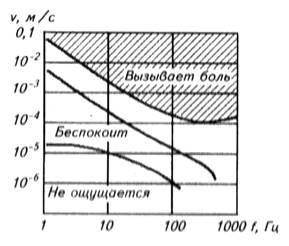 В зависимости от параметров (частота, амплитуда) вибрация может как положительно, так и отрицательно влиять на отдельные ткани и организм в целом. Вибрацию используют при лечении некоторых заболеваний, но чаще всего вибрацию (производственную) считают вредно влияющим фактором. Поэтому важно знать граничные характеристики, разделяющие позитивное и негативное влияние вибрации на человека (рис. 1).