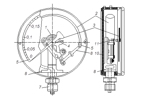 3 — стрелка ; 4 — зубчатый привод; 5 — шарнир; 6 — плечо;