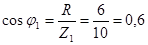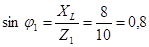Находим величину угла φ = arccos 0,6 = 53°. Так как во второй ветви включено только емкостное сопротивление ХС , то: cos φ2 = 0; sin φ2 = -1 ; φ2 = -90°.