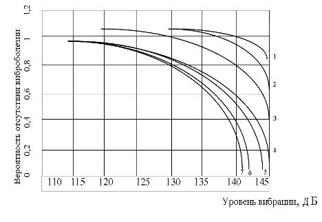 Рис. Вероятность отсутствия виброболезни: 1-7- при продолжительности работы соответственно 1,2,5,10,15,20 и 25 лет.