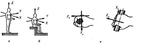 Рис. Направление координат осей при общей вибрации (а и б) и локальной(в):