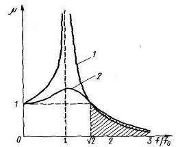 Следовательно, для достижения малого значения коэффициента передачи необходимо, чтобы частота собственных колебаний была значительно меньше частоты вынужденных колебаний. При f=f0 наступает резонанс - резкое увеличение интенсивности колебаний виброизоляционной машины (при частоте собственных колебаний близкой к частоте вынужденных колебаний применение виброизоляторов бесполезно), при f/ f0 >2 резонансныеколебания исключаются, а при f/f0 =3-4достигается эффективность работы виброизоляторов.