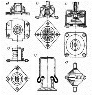 В качестве виброизоляторов применяют: стальные пружины или рессоры, прокладки из резины, войлока, а также резинометаллические, пружинно-пластмасовые и пневморезиновые конструкции, использующие упругие свойства материалов и воздуха и т.д. (рис.2.5.11.)