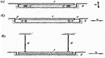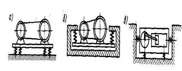 Рис. Схемы виброизоляциивиброактивного оборудования: а – опорный вариант; б – подвесной вариант; в – виброизоляция от вертикальных и горизонтальных колебаний.