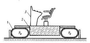 На рис. представлена схема виброизоляции поста оператора с применением пневмоамортизаторов. Воздух в пневмоамортизаторе находится под давлением 3-20 кПа, а нагрузка на пневмоамортизатор, выполненный в виде автомобильной камеры составляет 1000-4000 Н.