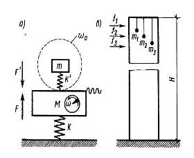 Рис. Динамические гасители вибраций: а – принципиальная схема гасителя; б – динамическое гашение колебаний дымовой трубы.