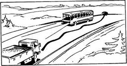 Резкие и частые изменения освещенности и яркости предметов требуют непрерывной адаптации зрения, в результате чего глаза водителя быстро утомляются. Наибольшая опасность возникает при ослеплении водителя светом фар: видимость резко ухудшается, а зачастую и совершенно пропадает. Если при ослеплении водитель не выполнит предписание Правил («не меняя полосу движения, снизить скорость и остановиться»), то в течение времени темновой адаптации движение автомобиля окажется неуправляемым, причем даже при малой скорости (30-40 км/ч) автомобиль проходит 100 м и более. В этих условиях водитель может не только не увидеть опасность или препятствие, но и не выдержать траекторию движения автомобиля. Как правило, он следит лишь за тем, чтобы рулевое колесо не меняло положения. Однако автомобиль способен изменить траекторию без участия водителя и выйти за пределы дороги (рис. 1). Более всего подвержен ослеплению утомленный водитель.