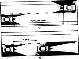 При ослеплении водитель на некоторое время теряет способность видеть. В случаях ослепления он должен включить аварийную световую сигнализацию, осторожно снизить скорость и остановиться на своей полосе. Во избежание ослепления дальний свет должен быть переключен на ближний не менее чем за 150 м до встречного транспортного средства (рис. 2а ), а также на большем расстоянии, если встречный водитель периодически переключает свет своих фар.